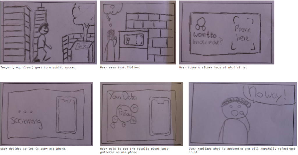This concept is an installation where people come by and put their phone on. The installation then scans their phone and shows them what apps/companies are gathering their data and what they’re doing with it. This installation is used in public spaces, libraries or museums. It is also part of a bigger thing that gives people tips on how to improve on data privacy and other facts.